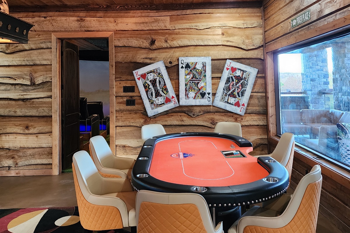 Game room with a 10-person poker table, 16 ft shuffleboard, and pool table